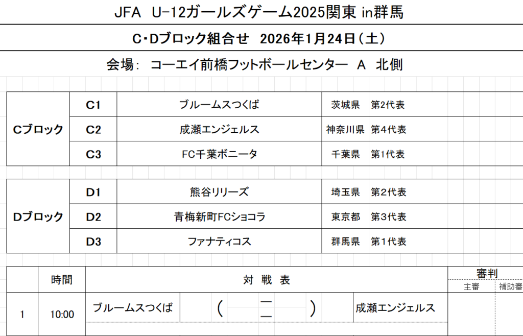 2026/1/24-25で開催される「JFA U-12ガールズゲーム2025関東 in 群馬」の組み合わせが決まりました!